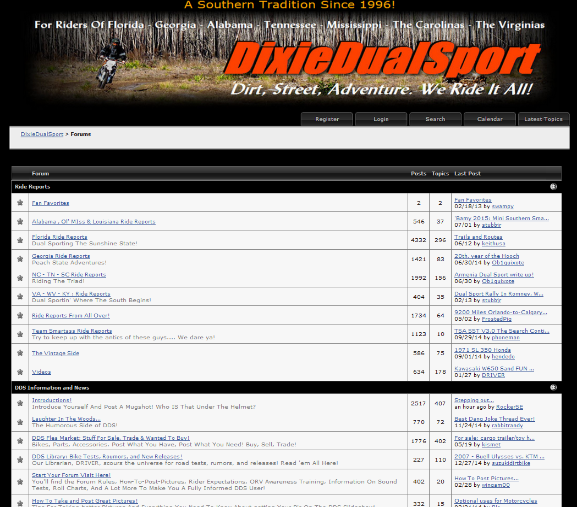 DixieDualSport Forum Many photos and stories from around the South and beyond. You Must Register To Use The Forum. It's Free So C'mon In! Create a Username, Create A Password and you're ready to share your stories! View The Forum ** Important ** Event Information Will Be Shared On The Forum. If You Plan On Attending DDS Events, You Must Register To Use The Forum. |